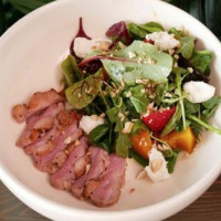 Ломтики обжаренного бекона с микс-салатом , сезонными овощами в медово-горчичном соусе