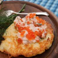 Драники в сливочном соусе со слабосоленой семгой и икрой 200/20/10гр