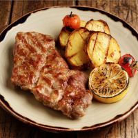 Сочный стейк, подается с картофелем Фри и фирменным соусом.