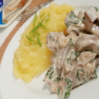 Кусочки свиного языка томленные в сливочном соусе с обжаренными шампиньонами и луком. Подается с картофелем.