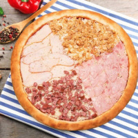 Пицца салями, охотничьими колбасками, куриной грудкой, беконом, спелыми помидорами и болгарским перцем под сыром Моцарелла