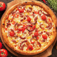 Пицца с охотничьими колбасками, копченной грудинкой, шампиньонами и спелыми помидорами под сыром Пармезан