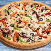 Пицца с копченой грудинкой, свежими шампиньонами, спелыми помидорами, болгарским перцем под сыром Моцарелла