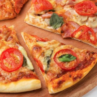 Пицца с беконом, копченой грудинкой, сочным помидором, болгарским перцем и шампиньонами под сыром Моцарелла