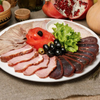 Телячий язык, ветчина, курица, свежий огурчик, помидор и болгарский перец, заправленные домашним майонезом.