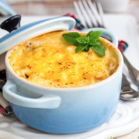 Кусочки свинины, молодой картофель, обжаренные шампиньоны и лук, запеченные под сыром и майонезно-сливочном соусе в горшочке.