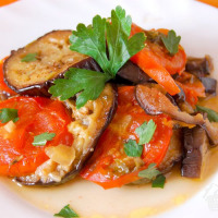 Ароматная говядина, запеченная с грибами и помидорами под сырной корочкой. Подается с оливками и зеленью.