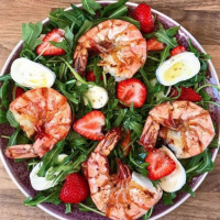 Микс из креветок, мидий, кальмара, на листьях салата с сочным помидором черри, рукколой, маслинами, приправленный фирменным соусом