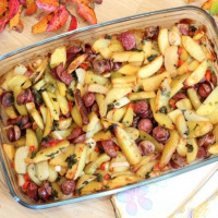 С охотничьими колбасками, запеченное под сыром и сливочном соусе.